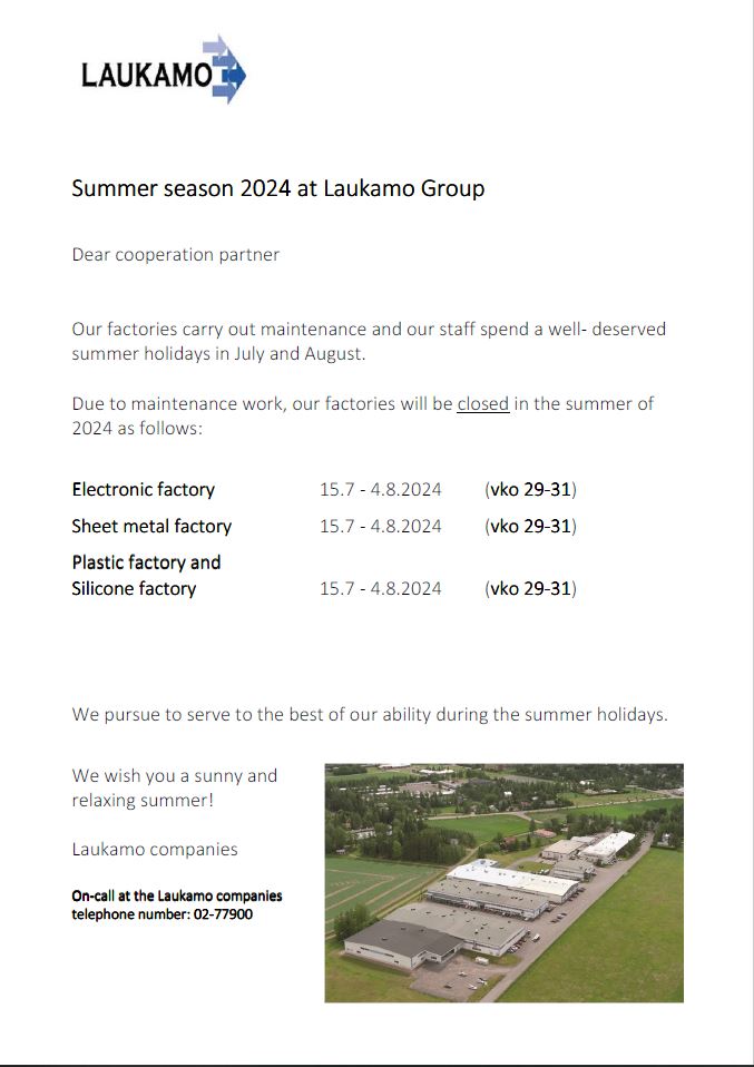 Summer Maintenance Break for Laukamo Group 15.7-4.8.2024
